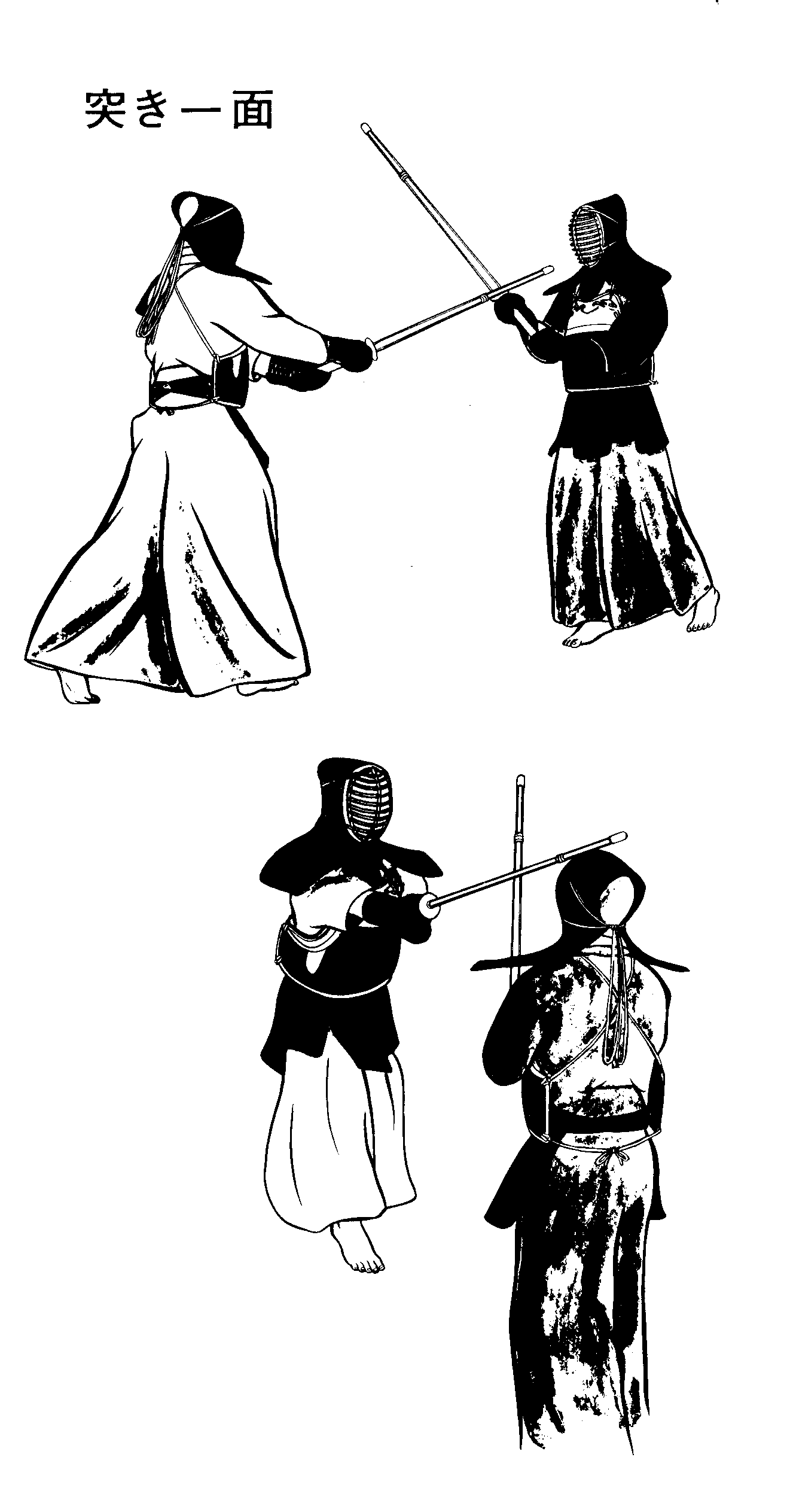 機を見て重心を移動させ、右足を踏み込んで突きを出します。直ちに左足を引きつけ右足を踏み込みながら正面を打ちます。